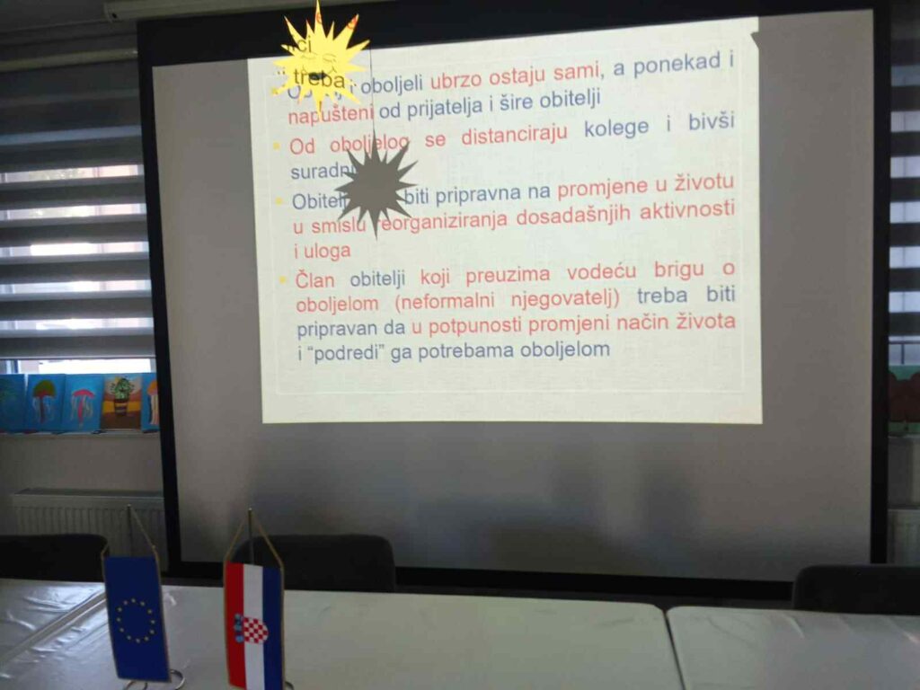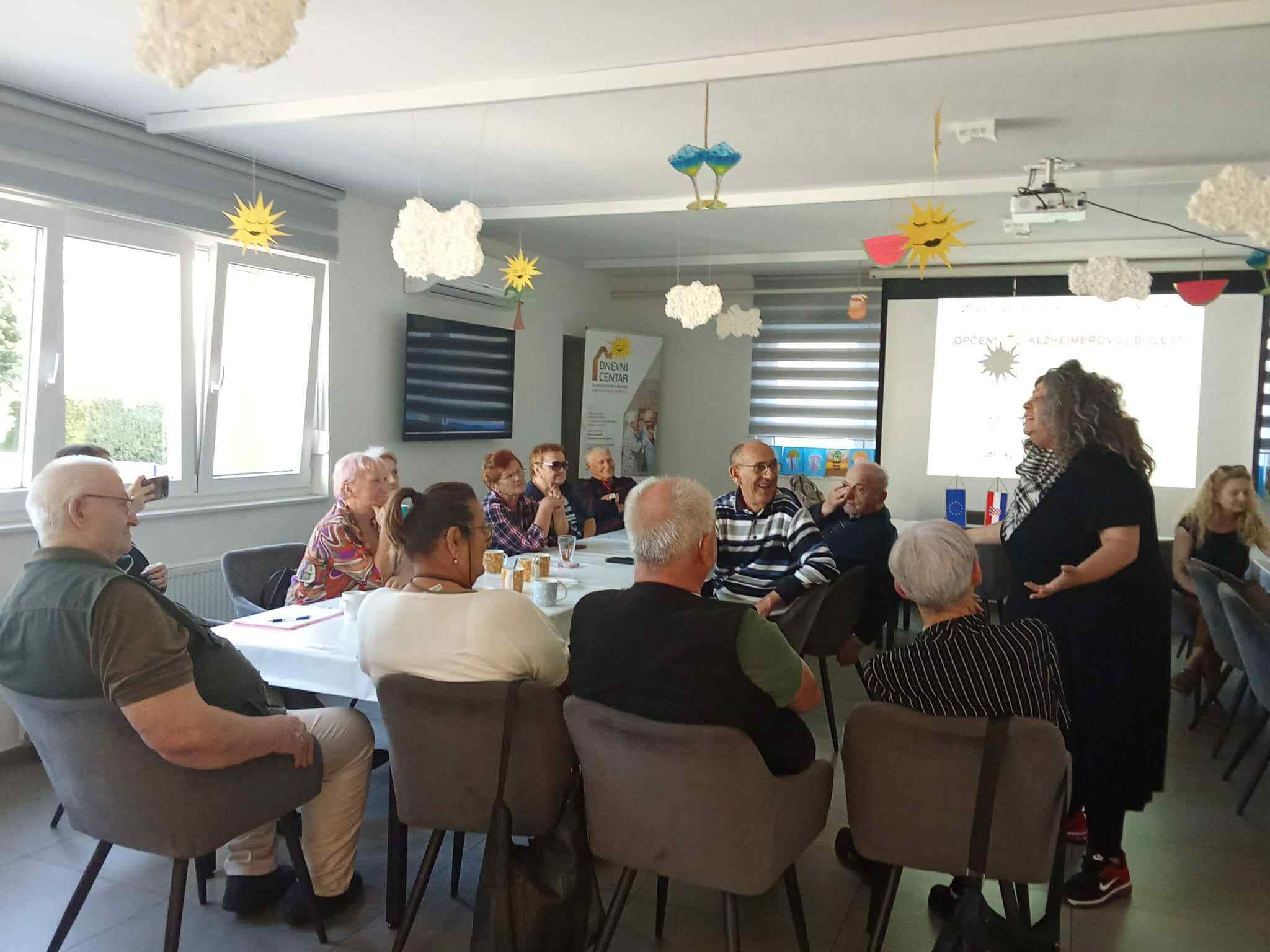 Alzheimerova bolest je socijalno-medicinski problem s posljedičnim teškoća u funkcioniranju obitelji. Duga je i teška bolest, te za sada neizlječiva, iscrpljujuća za oboljelog i njegovu obitelj. Stručnjaci upozoravaju i kako milijuni slučajeva demencije nisu dijagnosticirani što znači da se oboljelim osobama ne pruža stručna pomoć koja im je nužna. Alzheimerova bolest manifestira se kao zaboravljivost, izgubljenost u vremenu i prostoru, nemogućnost samostalnog življenja što dovodi do potpune ovisnosti o stalnoj skrbi i njezi druge osobe, te socijalne izoliranosti oboljelog i njegove obitelji, jer ponašanja oboljelog za društvo postaju “neprihvatljiva”. U obitelji dolazi do preraspodijele uloga, te emotivnog i materijalnog iscrpljenja. Član obitelji koji preuzima vodeću brigu o oboljelom (neformalni njegovatelj) treba biti pripravan da u potpunosti promjeni način života i “podredi” ga potrebama oboljelom – istaknula je voditeljica ovog Programa dr. sc. Daša Poredoš Lavor. Na kraju susreta korisnici su sudjelovali u rješavanju vježbe za poticanje kognitivno-mnestičkih sposobnosti pri čemu su bili iznimno uspješni.