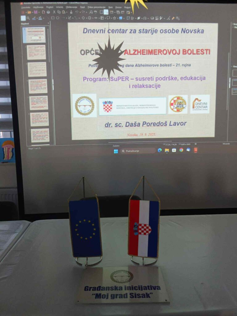 Građanska inicijativa „Moj grad Sisak“ u suradnji s Dnevnim centrom za starije i osobe i Gradskim društvom Crvenog križa Novska putem Programa SuPER – susreti podrške, edukacije i relaksacije daje doprinos razvoju specifičnih modela izvaninstitucionalnih oblika socijalne skrbi usmjerenih ka osobama starije životne dobi sa složenim zdravstvenim teškoćama koje žive u svom primarnom okruženju (obitelji), a prioritetnu skrb dobivaju od članova obitelji – neformalnih njegovatelja. U tu svrhu održana je još jedna razgovaraonica u Novskoj – ovaj put na temu Općenito o Alzheimerovoj bolesti povodom Međunarodnog dana Alzheimerove bolesti koji se u svijetu obilježava 21. rujna.